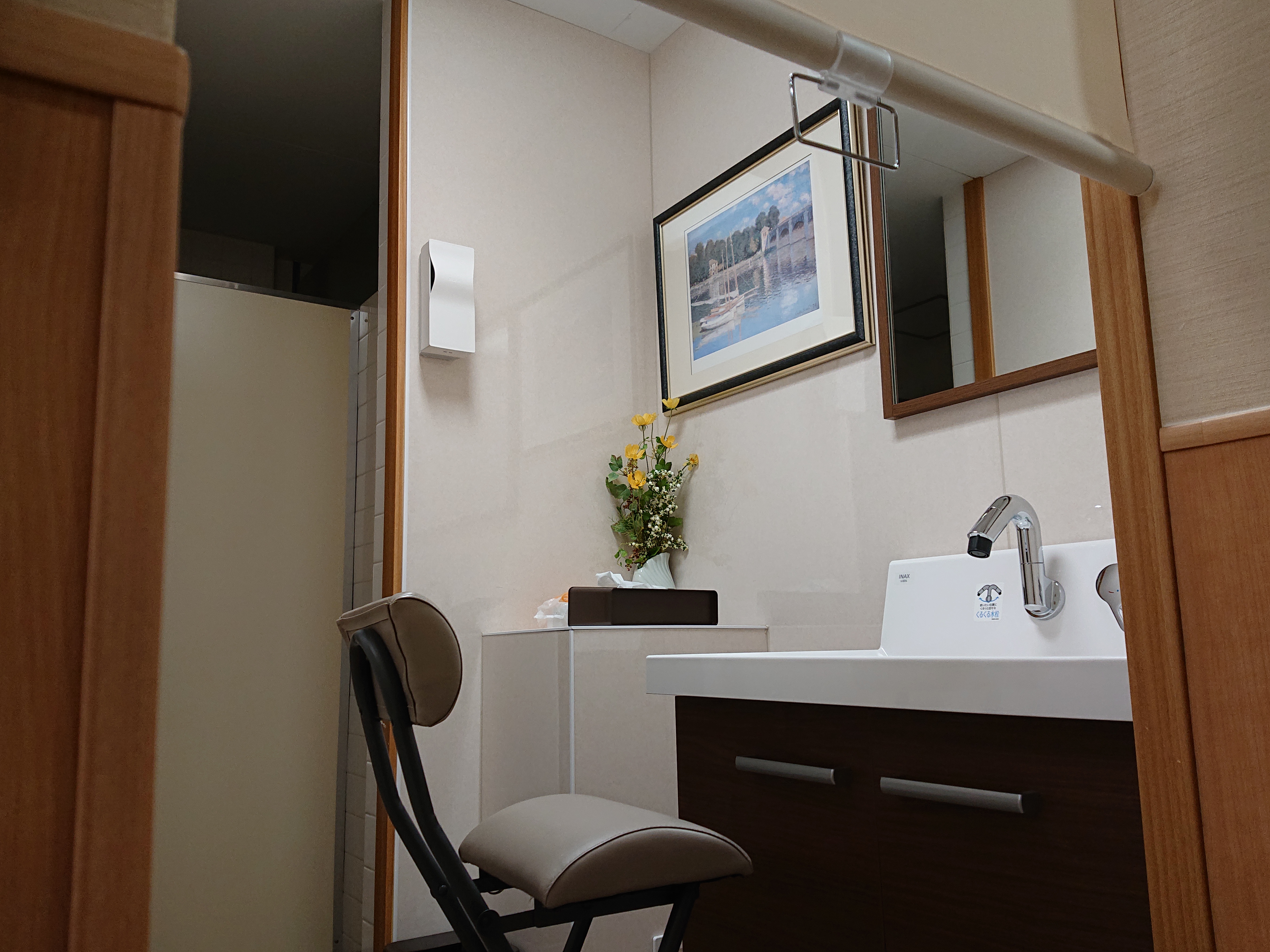 当院は女性専用の小部屋の透析室を、オーバーナイト透析の女性患者さんのため用意しています。安心してオーバーナイトの透析を受けて頂けるよう女性スタッフが設計し、着替え室も内部に組み込みました。今回、廊下をはさんで向かいにパウダースペースを整備しましたので、働く女性の朝の支度にお役に立つものと思います。(写真はパウダースペース:大きめの姿見に、ハイスツール、ロールスクリーンなど)