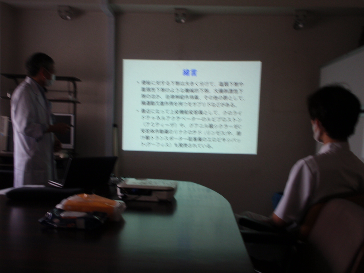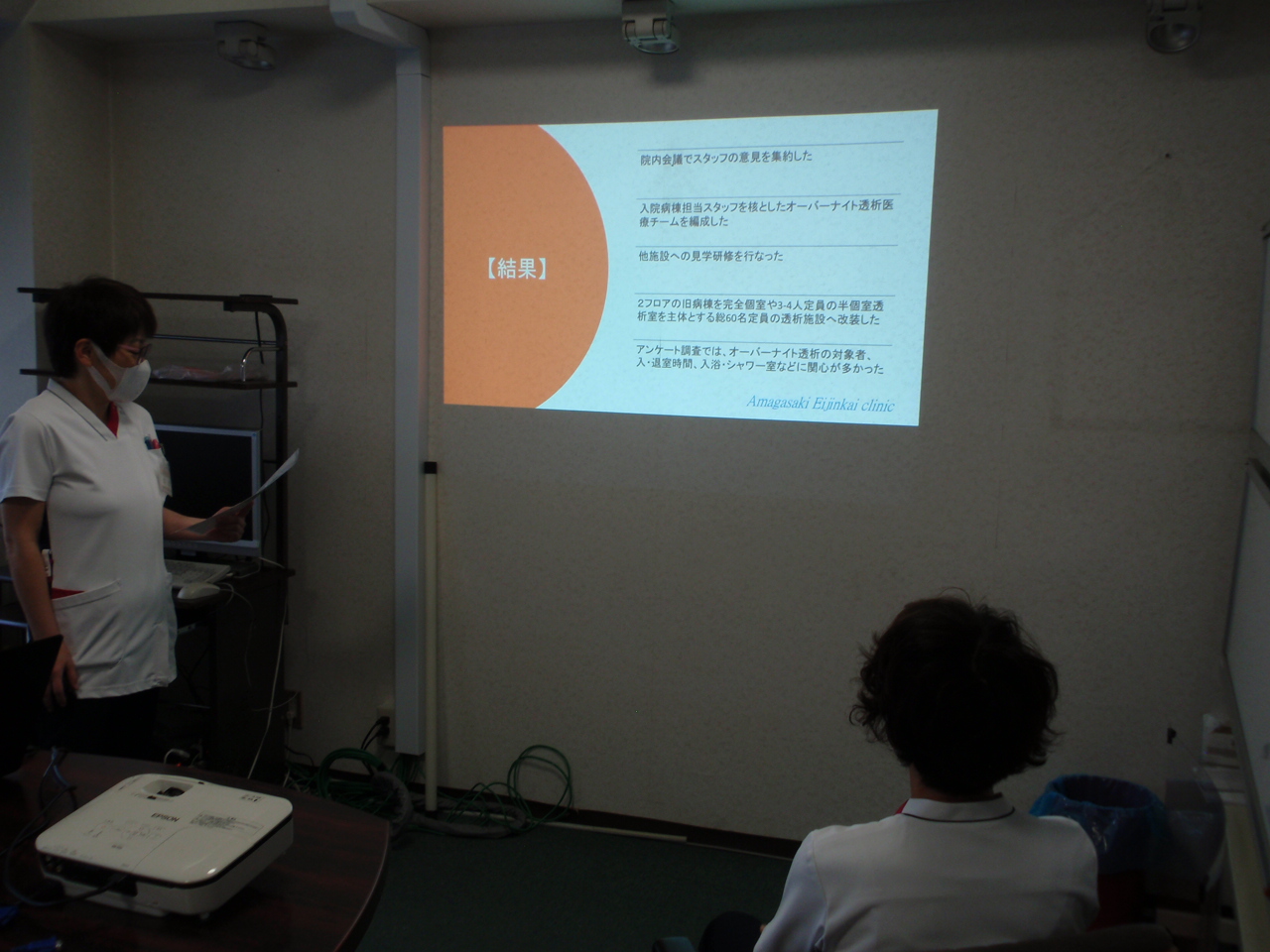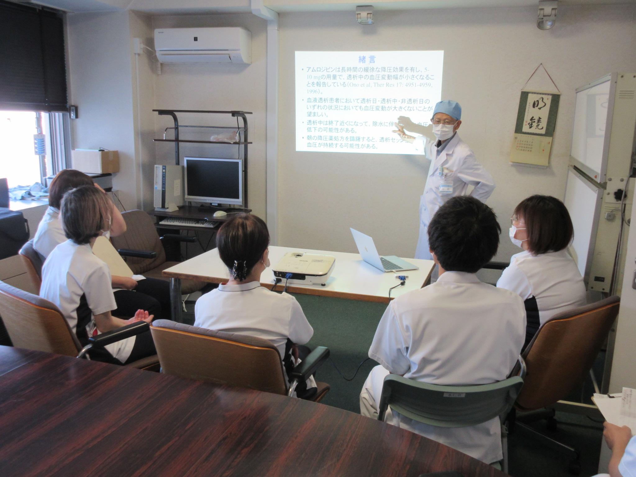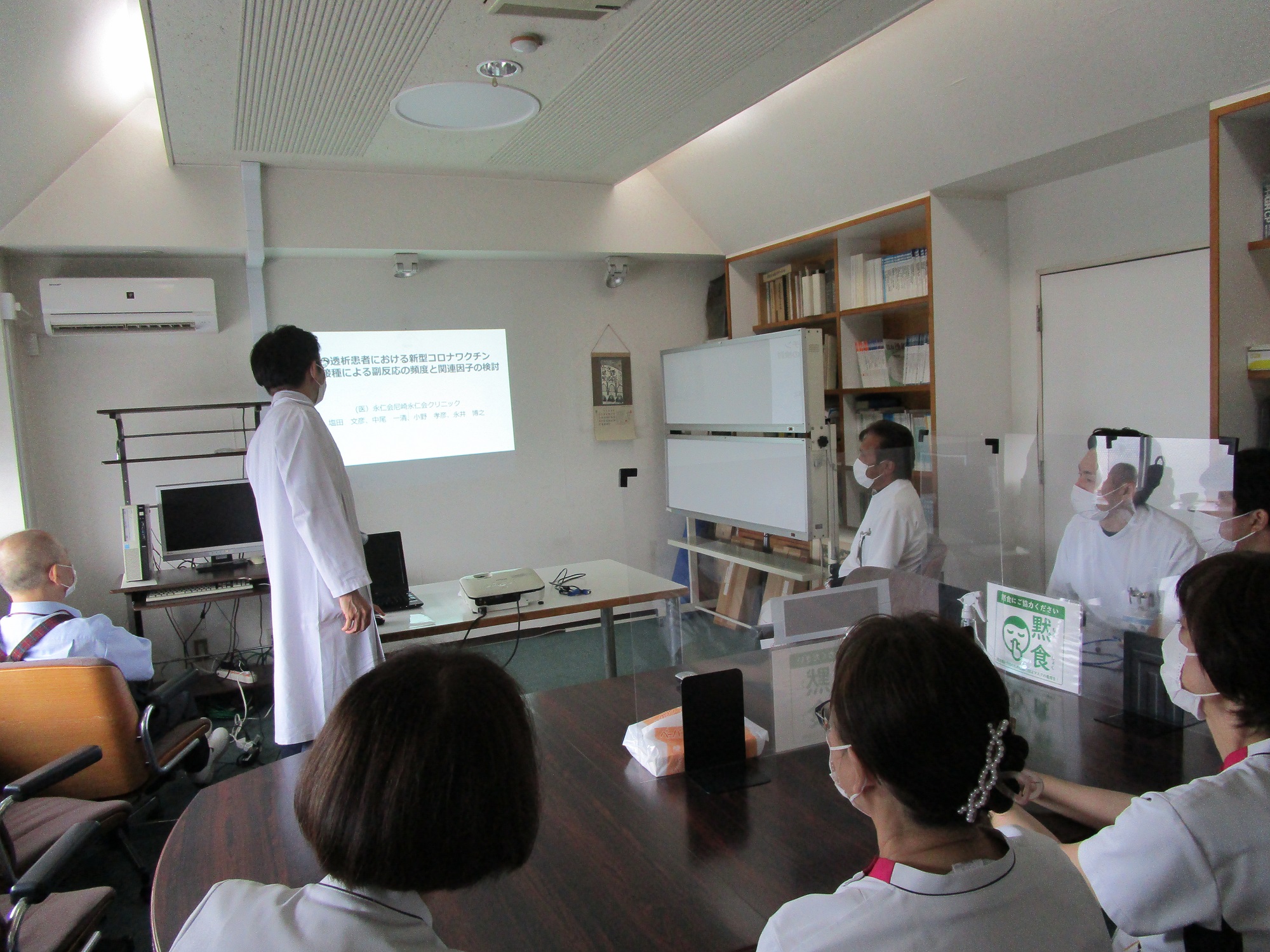 第67回日本透析医学会学術集会(2022年7月1 - 3日)にて、当院から2件の口頭発表と2件のポスター発表を行いました。10/19、口頭発表の院内報告会を開きました。院長が、透析日の朝の降圧薬の適切な処方と透析セッション中の血圧管理について、塩田医師から新型コロナウイルス ワクチン接種に伴う副反応について、それぞれ学会発表の報告を行いました。写真は院内報告会の様子です。