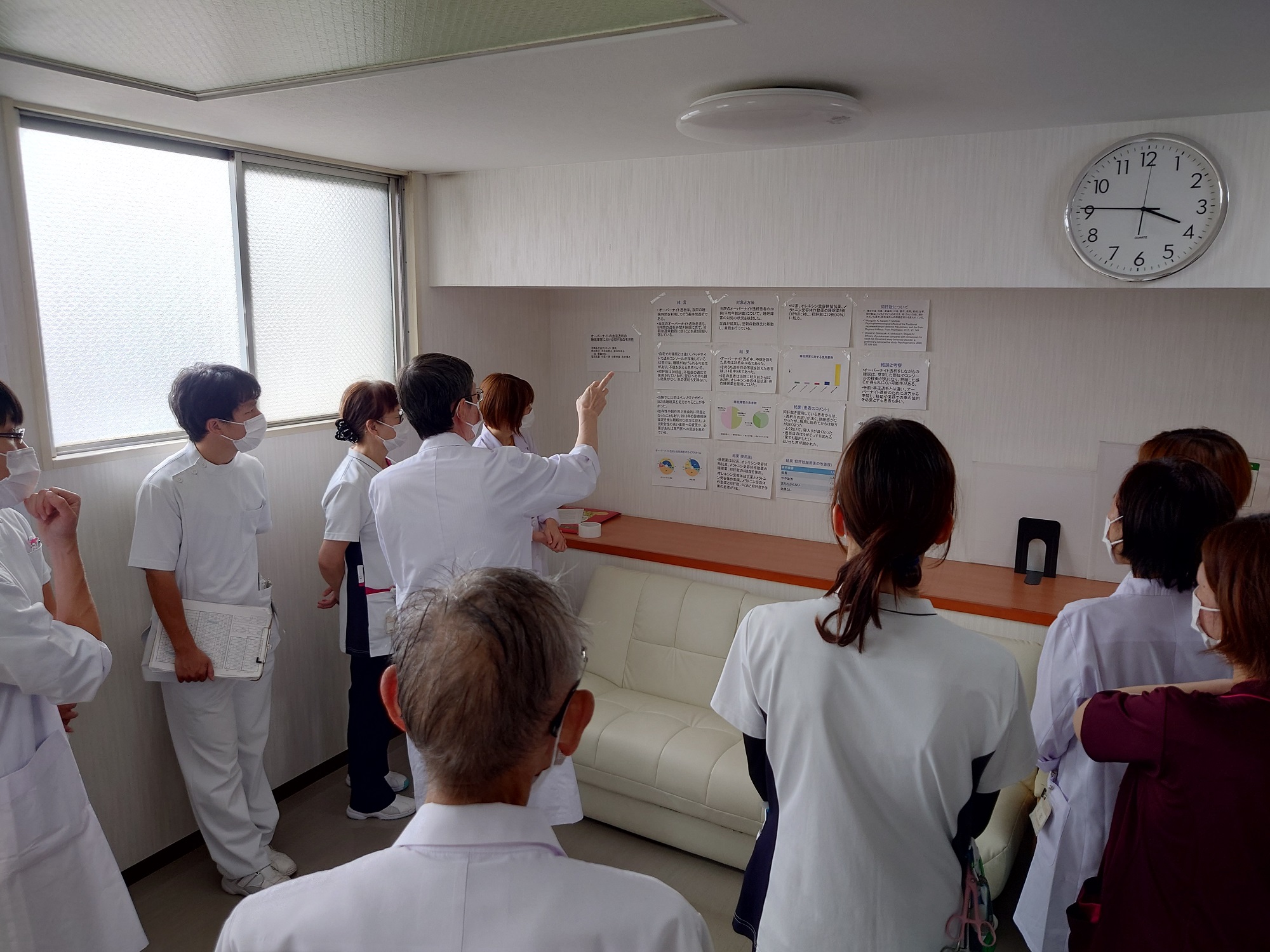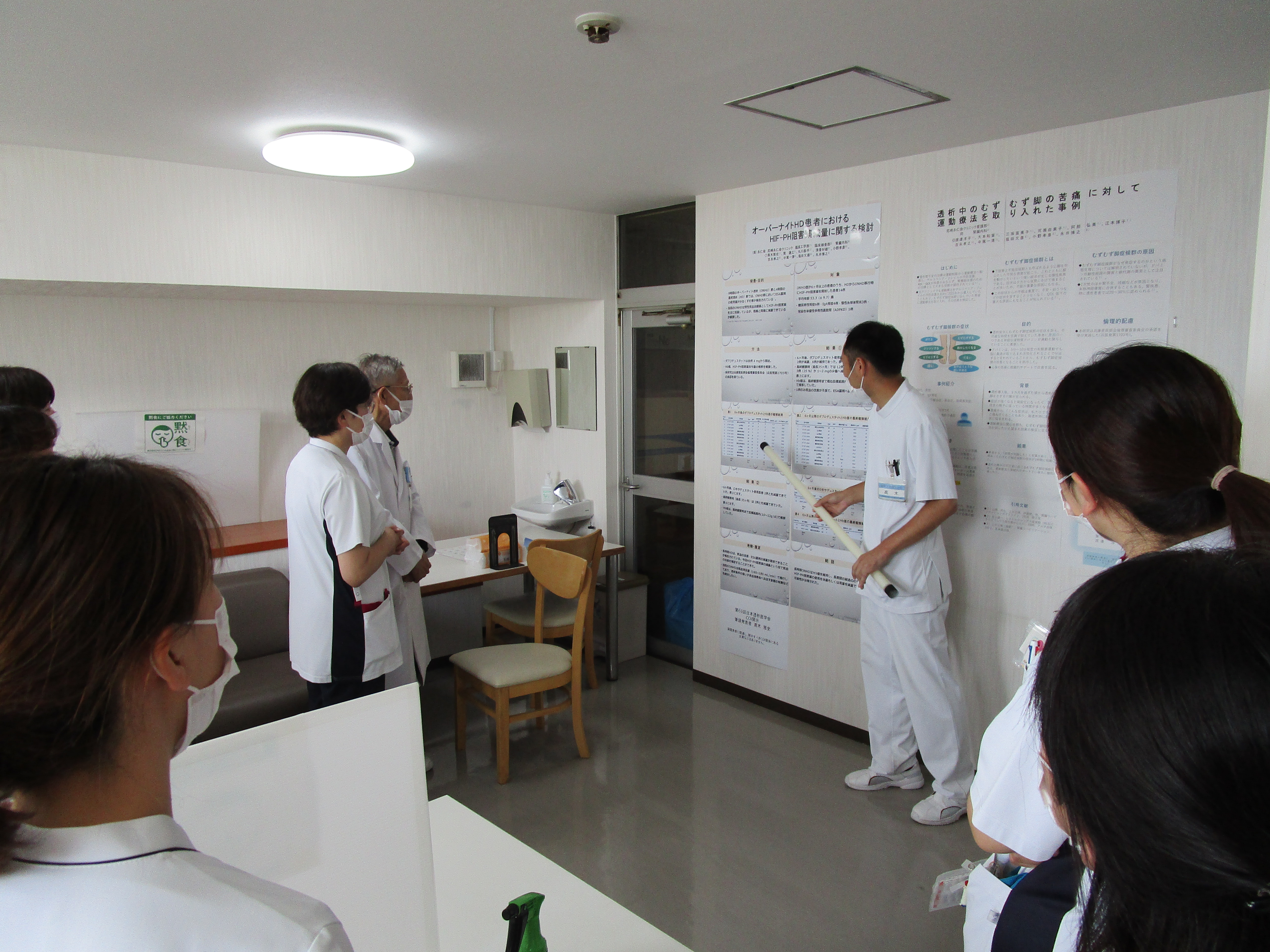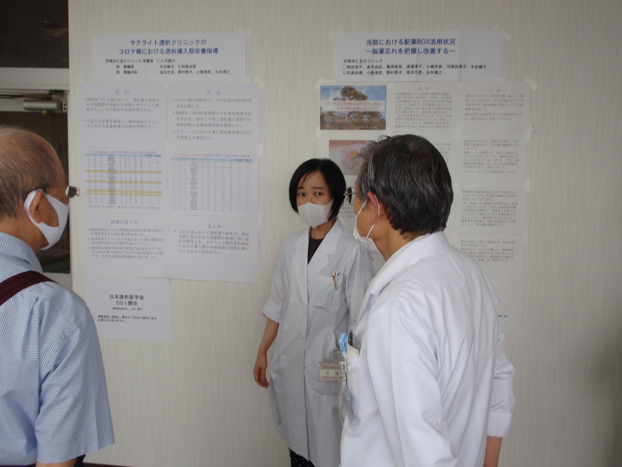 第67回日本透析医学会学術集会(2022年7月1 - 3日)にて、2件のポスター発表を行いました。10/21、ポスター発表の院内報告会を開きました。看護部から「オーバーナイト透析において注射薬を経口薬に変更した業務改善の経過」を発表し、薬剤部から「当院の維持透析患者における慢性便秘症の治療薬剤の考察」を発表しました。写真は院内報告会(ポスター)の様子です。