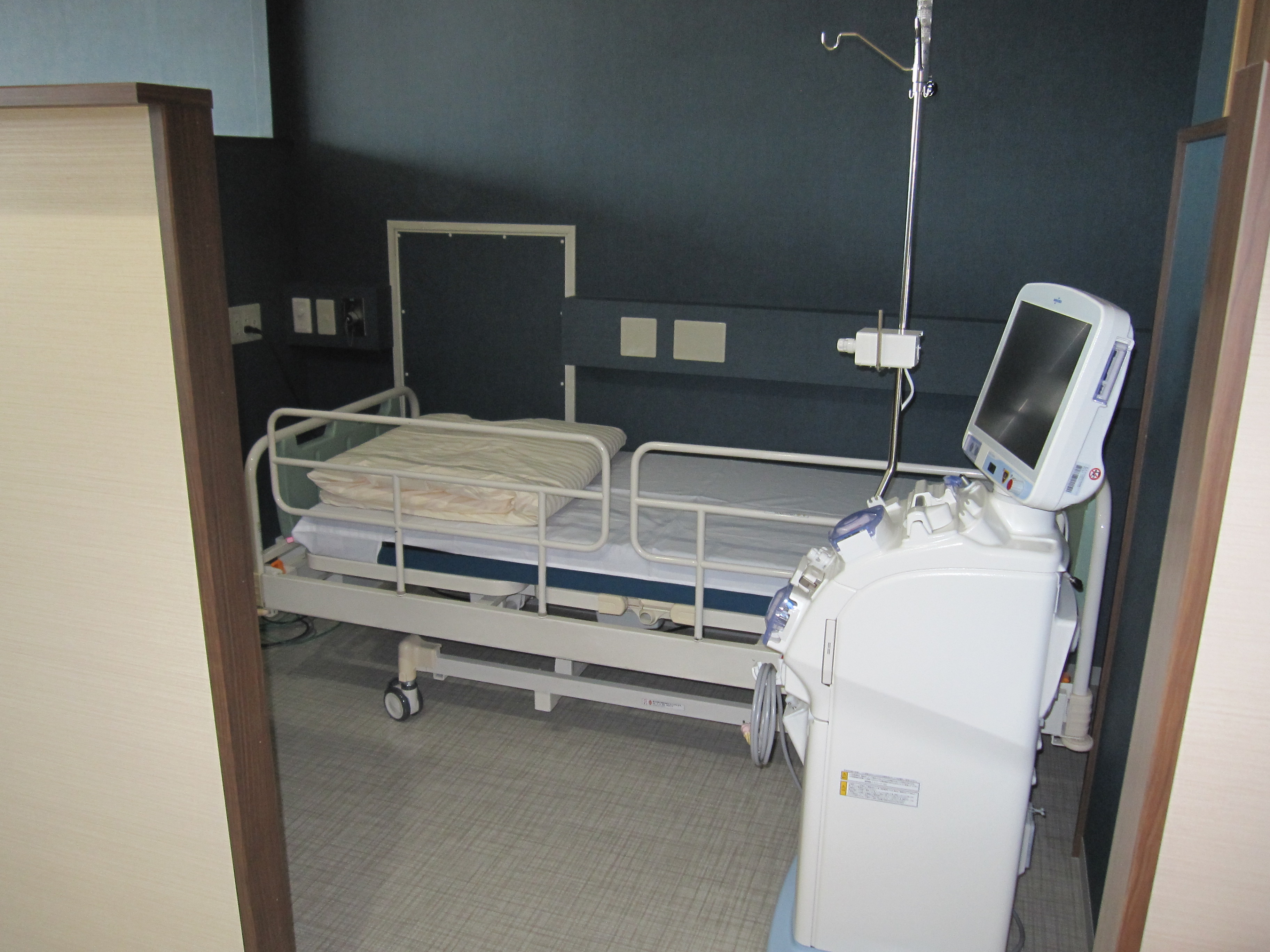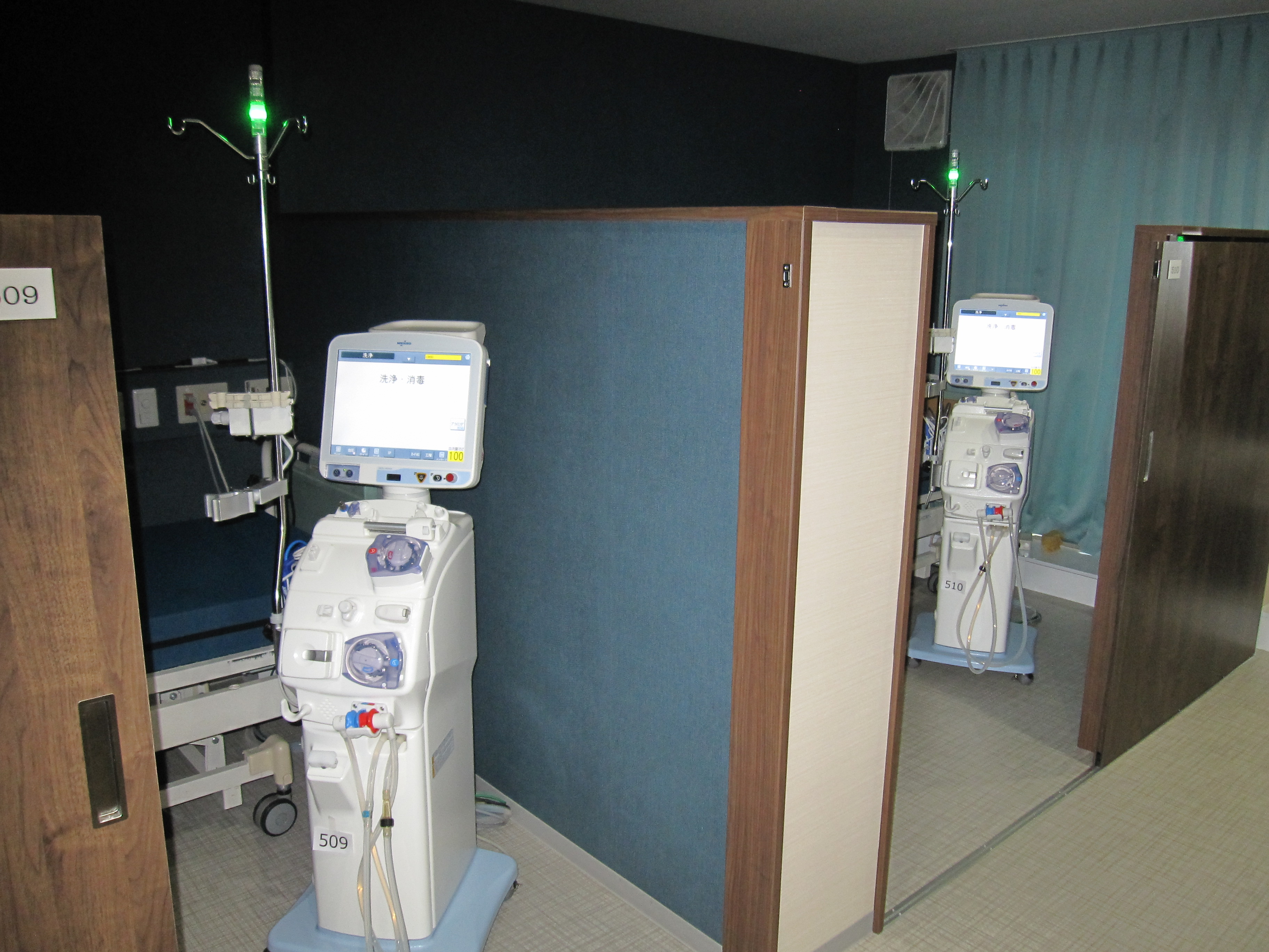 9月下旬からオーバーナイト透析を開始することになり、受け付け中です。オーバーナイト透析の透析ベッド数は30床あり、そのうち、完全個室を2部屋用意しています。間仕切りでゆとりをもって区切られた半個室タイプが主体です。入院病棟の経験があるスタッフが中心となり対応するので、深夜のオーバーナイト透析も安心して過ごしていただけます。大阪・神戸・西宮からも交通至便で、当院のオーバーナイト透析に関心をお持ちの患者様はお問い合わせ下さい。この写真は半個室タイプの部屋で、引き戸を閉めればプライバシーが
