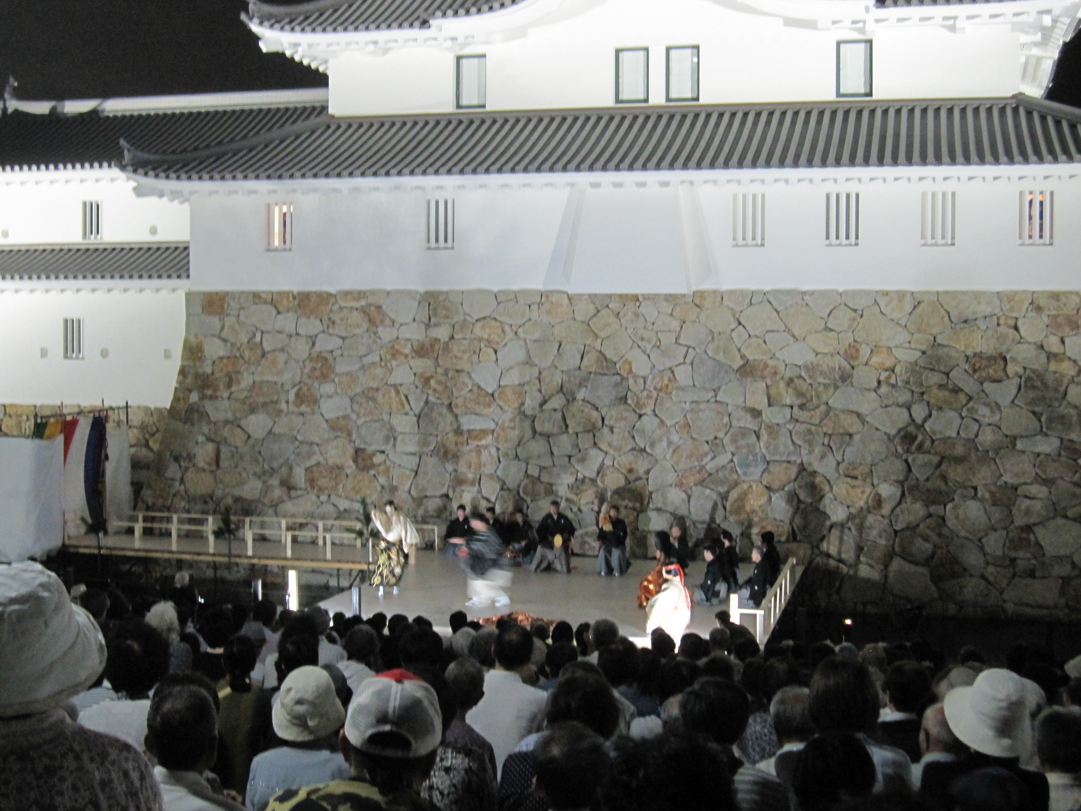 日没後に川向かいの尼崎城で、薪能「葵上」が上演され、当院スタッフと患者様で一緒に観能しました。堀割の水の上に特設ステージが設置され、城の外壁が舞台の後ろ正面(鏡板の場所)というアイデアで、謡いの声やお囃子の音も良く響きました。幻想的な雰囲気の中で鬼と修験者が戦い、源氏物語を題材にした優美さと緊迫感あるひと時を味わいました。邪気を払い心静かなエンディングを迎えました。なお、観能に先立って、9月10日に院長による「葵上」の見どころ解説の会を院内で開きました。