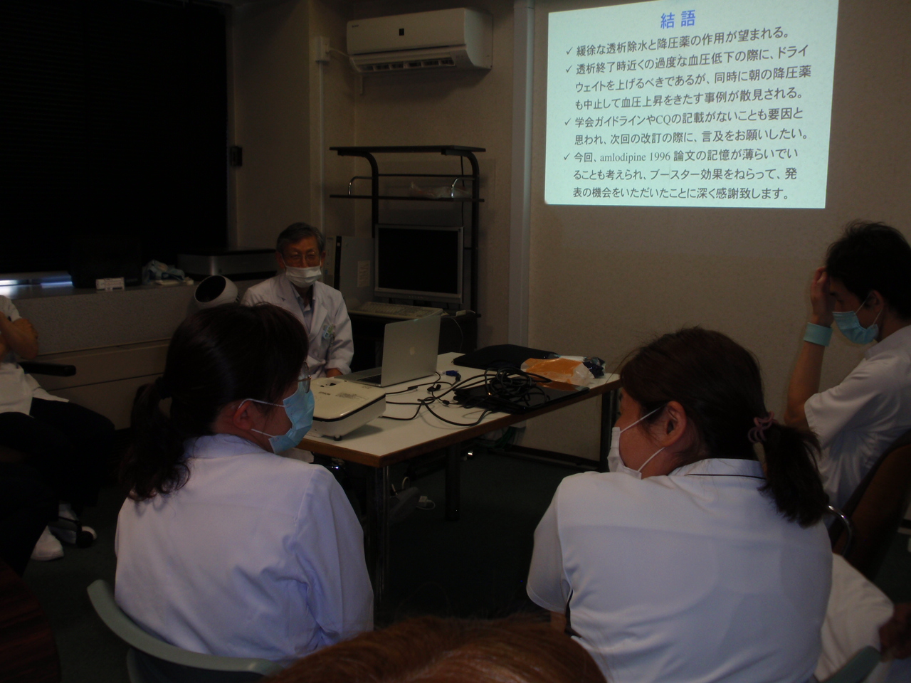 第24回兵庫県腎疾患懇話会(2021年7月15日)にて、小野孝彦院長が発表を行いました。研究会の発表と討議はオンライン形式で行われました。慢性腎不全における血液透析において、透析終了近くの過度な血圧低下は、まず目標体重をアップして除水を緩めるべきこと、また同時に降圧薬をスキップすることを避けるべきと、まとめました。そして1996年に英文で発表したアムロジピン論文を再訪し、有用性は揺らいでいないと述べました。写真は後日の院内報告会の様子です。